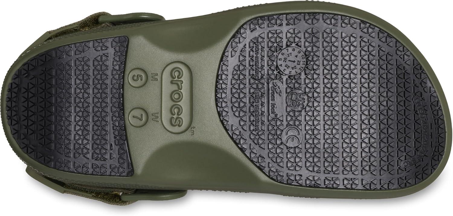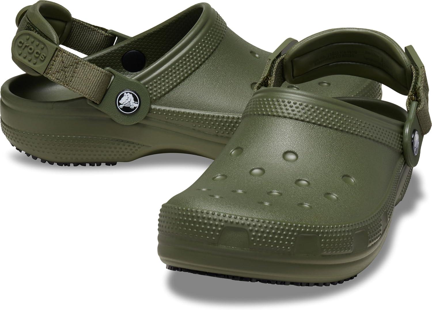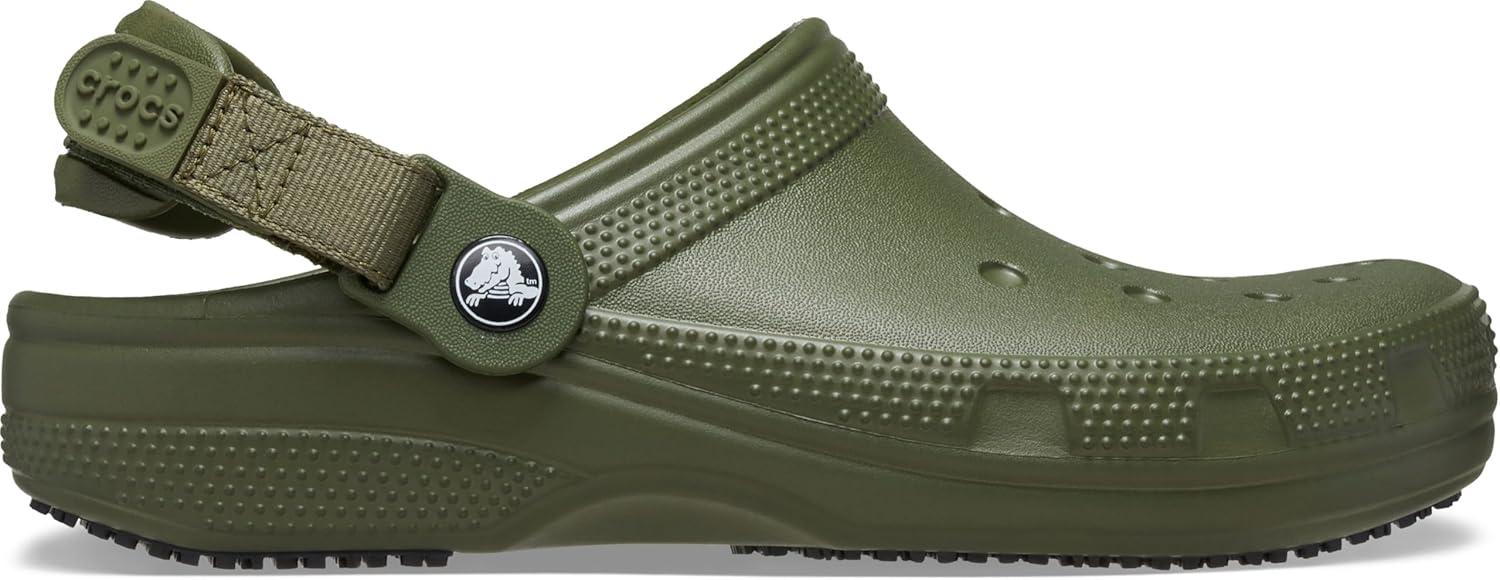 Enjoy the comfort and style of the iconic clog, now with a slip-resistant outsole and unique adjustable heel strap. In this versatile clog, you'll have the benefit of enhanced traction and security, which can meet a variety of needs. The specially-designed heel strap adjusts to be extra secure, and is easier to get on and off with its textured pull tabs. Features the same Crocs Lock slip-resistant treads as found in the Crocs At Work collection. Plus, Jibbitz holes on the upper makes them easy to personalize. The Classic SR Clog offers the opportunity to be confident, secure and comfortable in your own shoes. Find Your Size: We recommend sizing down (e.g. if you are a 7.5, size down to a 7). Meets EN ISO 20347:2012, OB, SRC. Meets ASTM F2913-11, CE certified. Waterproof ethylene vinyl acetate upper. Unlined. Ethylene vinyl acetate insole. Enclosed, round toe silhouette. Iconic Crocs Comfort. Pivotable, adjustable backstrap. Crocs Lock slip-resistant tread. Rubber outsole.